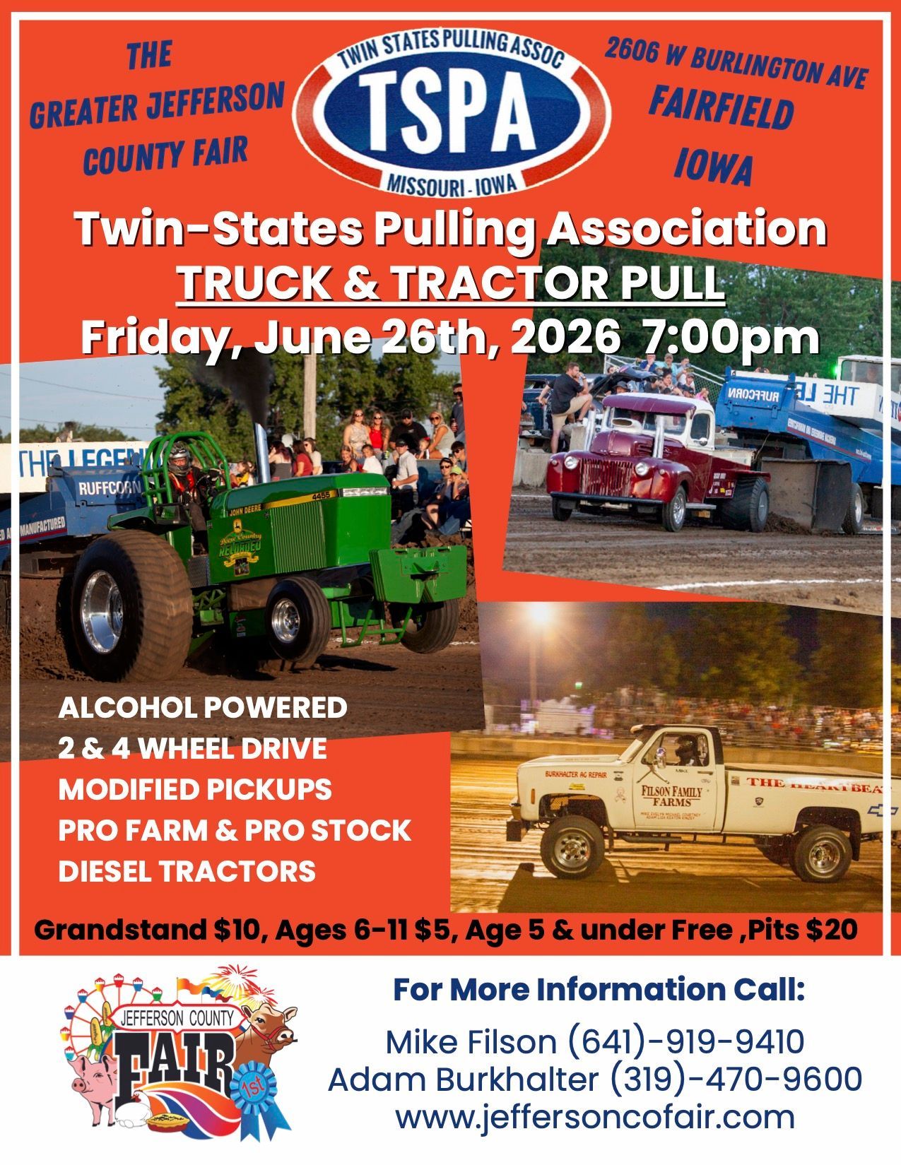 TSPA, TWIN-STATES PULLING ASSOCIATION Truck & Tractor Pull at the Greater Jefferson County Fair on Friday Night of the Fair! Come enjoy the fun.